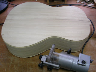 Here, the top and back binding ledges are routed. The rest of the unfinished ledge towards the neck, will be removed by hand (chisel that is). The router will be going for another round to clean up and even out the earlier rout.